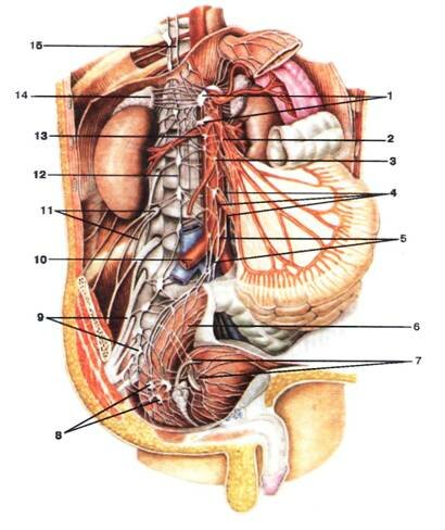 1-colon transversum; 2-anastomosus arteriosum (arcus Riolani); 3-v. mesenterica inferior; 4-à.mesenterica inferior; 5-pars abdominalis aortae; 6-à.colica sinistra; 7-à.sigmoidea; 8-à.rectalis superior; 9-v. iliaca communis; 10-colon sigmoideum; 11-a. iliaca communis dextra; 12-v. cava inferior; 13-ansae intestinales; 14-mesentericum; 15-a. colica media