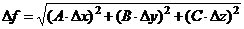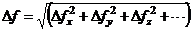 Спільний розподіл навколо f, що враховує окремі розподіли кожного з аргументів (3.33), повинна визначати похибка непрямого вимірювання ?f. Ці розподіли нормальні і незалежні, тому дисперсія їх спільного розподілу дорівнює сумі їх дисперсій, що строго доведено в математичній статистиці. Тоді середнє квадратичне відхилення спільного розподілу, що обчислюється як корінь із дисперсії, знаходиться з виразу: