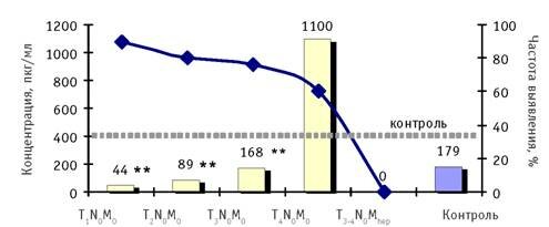 Столбики — концентрация цитокина, пкг/мл (левая ось); кривая — частота выявления цитокина, % (правая ось). Достоверность различий:(р < 0,01) по сравнению с группой контроля;(р < 0,02) и (р < 0,01)по сравнению со стадией Т12N0M0. Частота выявления цитокина в контрольной группе — 0 %.