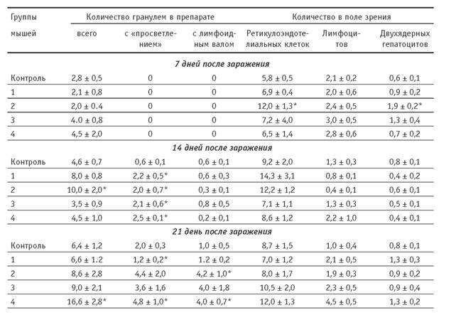 го вала, а также явления слабо или умеренно выраженной мезенхимально воспалительной реакции. Дистрофические изменения гепатоцитов ни в одной из групп не выявлялись. Поморфометрическим данным,у мышей 3 и 4 й групп наблюдалась тенденция к увеличению числа гранулем по сравнению с данными в контрольной группе. При введении различных доз Глутоксима отмечается тенденциях увеличению числа ретикулоэндотелиальных клеток в печеночных дольках. По сравнению с контрольными показатели числа ретикулоэндотелиальных клеток в 1 и 2 й группе мышей были статистически достоверно более высокими. Во всех сравниваемых группах число лимфоцитов, диффузно рассеянных по ходу печеночных балок, было сходным. Количество двуядерных гепатоцитов (косвенный показатель усиления регенераторных процессов) у мышей, леченных различными дозами Глутоксима, было повышено.При этом у мышей 2й группы этот показатель статистически достоверно отличался от данных контрольной группы (см. табл. 3).Таким образом, на 7 е сут. после заражения мышей МБТ, по данным морфологического и морфометрического исследований, в легких нелеченных и леченных различными дозами Глутоксима различий не выявлено. В печени мышей, получавших Глутоксим, по сравнению с данными в контроле отмечена тенденция к увеличению числа ретикулоэндотелиальных (купферовских) клеток и двуядерных гепатоцитов, причем в 1 и 2 й группах эти различия были статистически достоверными. Выявленные изменения свидетельствуют о выраженном активирующем воздействии Глутоксима на макрофагальную систему, что приводит к увеличению числа макрофагальных гранулем икупферовских клеток в печени. Кроме того, Глутоксим, по видимому, оказывает стимулирующее действие на пролиферативные процессы (увеличено число двуядерных гепатоцитов), однако это требует более детального подтверждения с помощью более точных методов исследования (авторадиография). На 14 е сут. эксперимента при микроскопическом исследовании в легких мышей всех групп на фоне уже описанных в предыдущий срок изменений выявлялись единичные в препарате (1–3) макрофагальные гранулемы с тенденцией к просветлению. При морфометрическом исследовании показатели объемной плотности очагов туберкулезной пневмонии в сравниваемых группах были сходными. Статистически не различались и показатели числа нейтрофилов в составе инфильтрата. Содержание лимфоцитов в воспалительном инфильтрате у мышей 3 и 4 й групп было достоверно ниже, чем в контрольной группе (см. табл. 2).В печени мышей 1 и 2 й групп число гранулем было выше, чем в контроле (р < 0,05) (см. табл. 3).При этом у мышей, леченных Глутоксимом, было более высокое число зрелых гранулем (с «просветлением»); показатели числа гранулем с лимфоидным валом в опытных и контрольной группах не различались. У мышей 1 и 2 й групп наблюдалось достоверное увеличение по сравнению с контролем числа ретикулоэндотелиальных клеток. Число лимфоцитов и двуядерных гепатоцитов было сходным в сравниваемых группах. Таким образом, на 14е сут. экспериментального туберкулеза у мышей в легких под влиянием Глутоксима, примененного в дозах 1 и 5 мг/кг, выявлено достоверное снижение лимфоцитов всоставе воспалительного инфильтрата, что указывает на иммунотропный эффект препарата. В печени, по данным морфометрического исследования у мышей, получавших Глуто