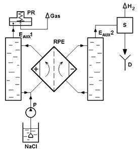 Анодная и катодная камеры реактора РПЭ установки соединены с емкостями соответственно анодного и катодного циркуляционных контуров, выполненными в виде замкнутых трубопроводов из поливинилхлорида марки ПВХ-ХЛОР. Емкость анодного циркуляционного контура снабжена клапаном-регулятором давления «до себя», который поддерживает повышенное давление в анодном циркуляционном контуре и препятствует потерям раствора хлорида натрия.
